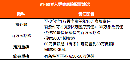 这个年龄段的人正是家庭的顶梁柱,处于上有老下有小的阶段,承担着大部分的家庭责任,在经济条件允许的情况下,要保障全并且保障额度最好能高一些,配置方案建议如下图所示(不分先后,建议全部配置):