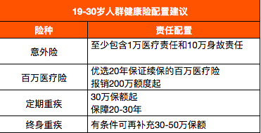 这个年龄段大多是单身贵族,基本没有什么家庭压力,所以保障自己的身体健康还是第一要务,保障的产品种类基本与青少年一样,配置方案建议如下图所示(保险配置顺序由上至下):