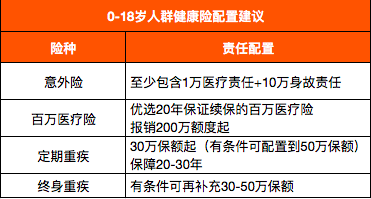 儿童最重要的是平安健康成长,并不负担家庭经济压力,所以对于儿童主要保障的是意外和疾病风险,配置方案建议如下图所示(保险配置顺序由上至下):