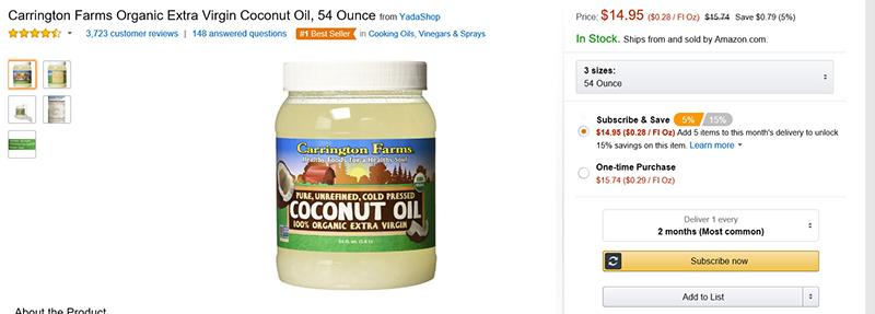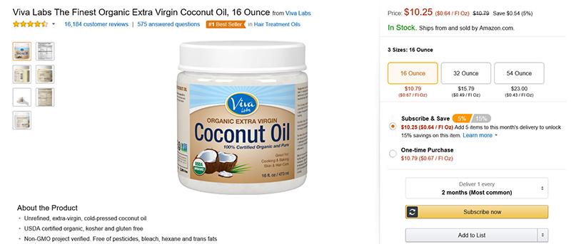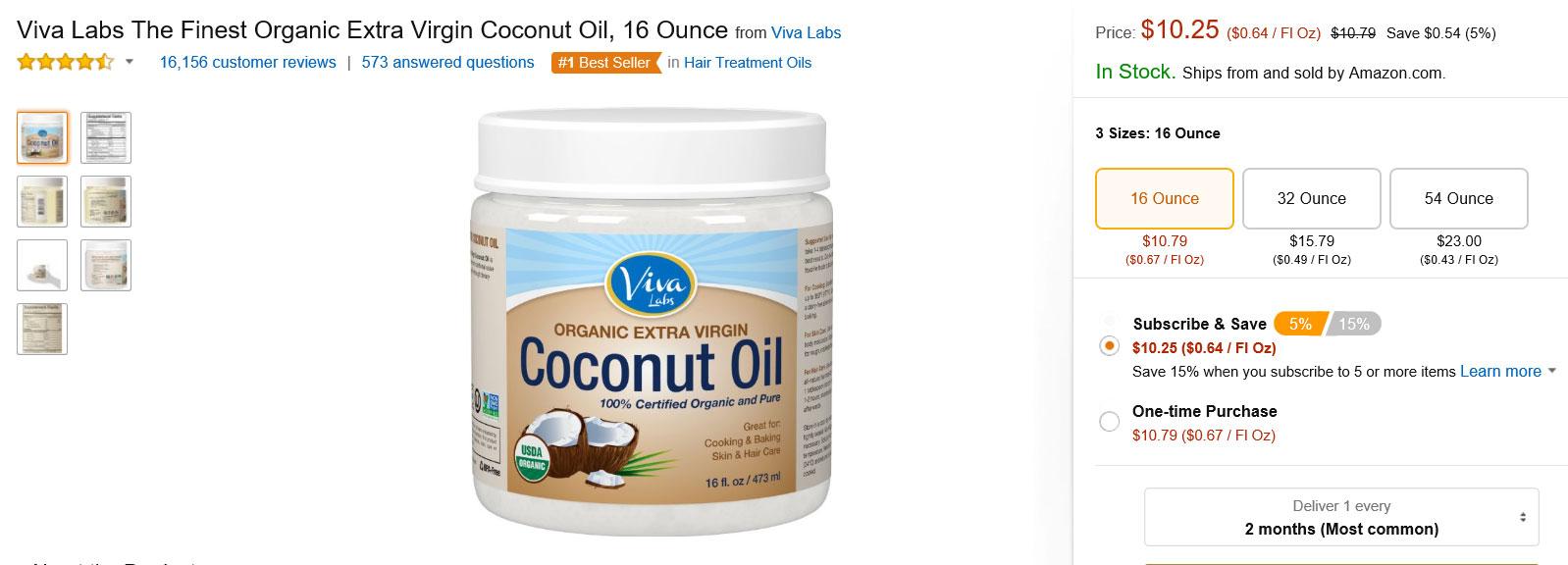 再看价格,美亚上卖得最好的viva labs椰子油10刀/16盎司,约合人民币¥67/斤,价格是市面上初榨橄榄油的2倍。