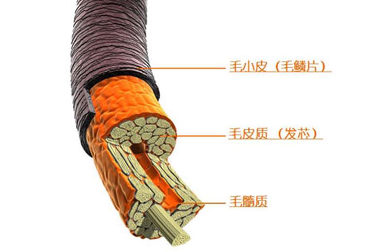 看看头发的结构——头发由外而内分为三层,分别是毛小皮、毛皮质和毛髓质,其主要成分是角蛋白。