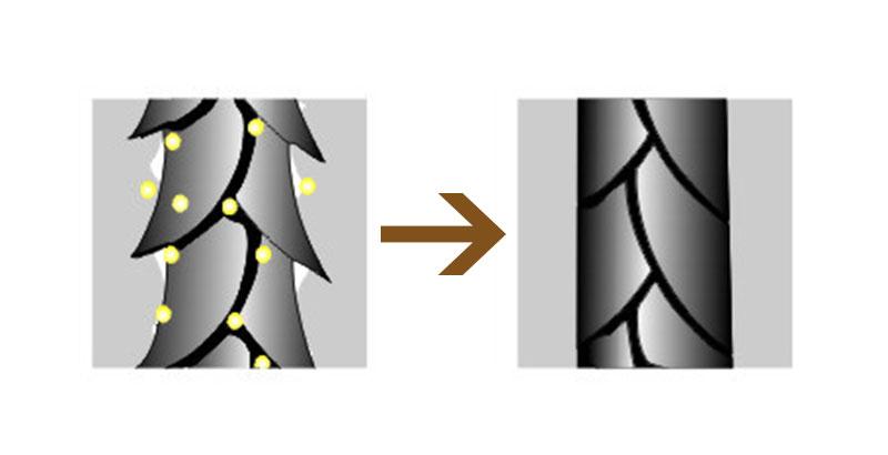 头发受损原因主要是毛鳞片在染烫、梳洗过程中,产生摩擦变形,使毛发变得毛躁。